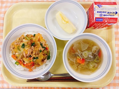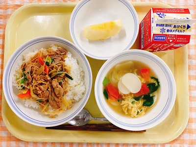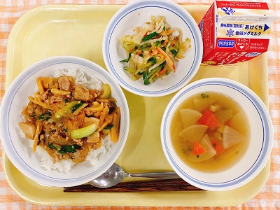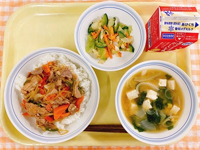 牛乳 焼肉丼 豆腐とわかめのスープ