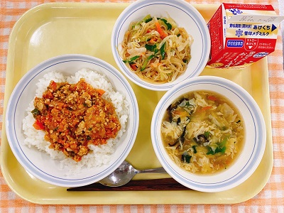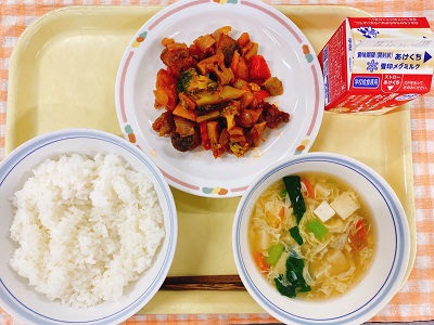 牛乳 ご飯 いかのチリソース チャーホーサイ 豆腐の中華スープ