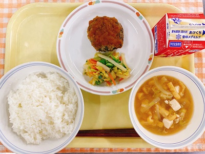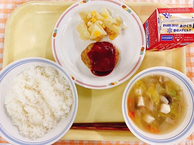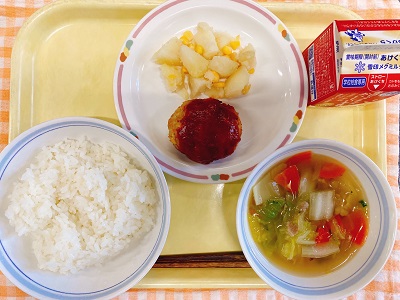 牛乳 ご飯 ハンバーグ コーンポテト 白菜と豆腐のスープ