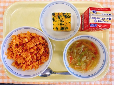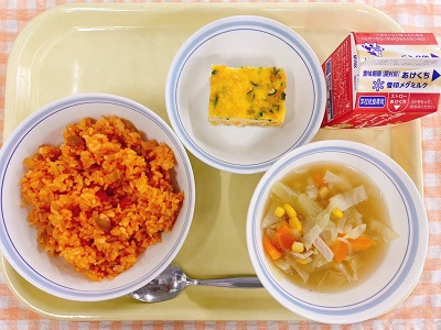 牛乳 チキンライス チーズ入りオムレツ キャベツとコーンのスープ