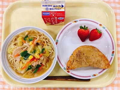 牛乳 味噌ラーメン 野菜たっぷり揚げぎょうざ いちご