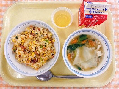 牛乳 焼豚チャーハン ワンタンスープ アップルゼリー