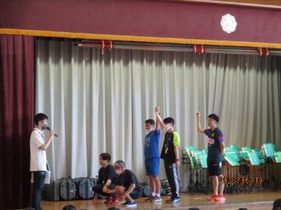 1,2,3年生は、体育館で大きなスライドで「いかのおすし」について学んだり、代表児童によるロールプレイをしたりしながら、学習しました。