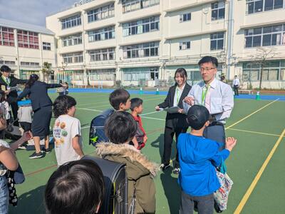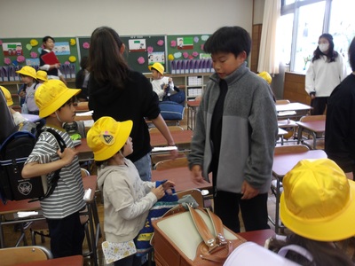 1年生の朝の登校に合わせて、6年生が手伝いに来てくれています。