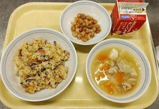 献立:チャーハン 牛乳 豚肉と豆腐の中華スープ 甘辛カリカリ豆産地:〇しょうが・・・高知 〇にんにく・・・青森 〇ねぎ・・・千葉 〇にんじん・・・徳島 〇小松菜・・・東京 〇たまねぎ・・・佐賀 〇キャベツ・・・愛知