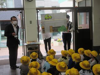 まずは、横断歩道の歩き方についてのお話を聞き、その後は実際に学校前の横断歩道を歩く練習をしました。