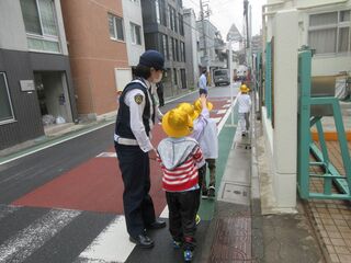 歩行訓練とは、大田区教育委員会の交通指導員の方と、大森警察署の方をお招きし、横断歩道の渡り方を学習するものです。