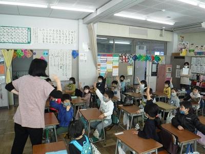 2校時 3.4年生は各教室でオンライン、5年生は体育館