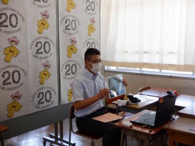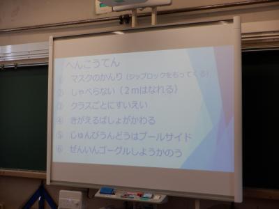 本日の朝会では、プールに入るときの約束に加え、感染防止対策として今年度から取り入れる取組について説明をしました。
