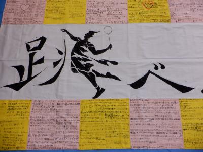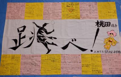 「桃田選手を応援したい!!」という開桜小の子供たちの熱い願いを込めて、応援の横断幕を作成しました。