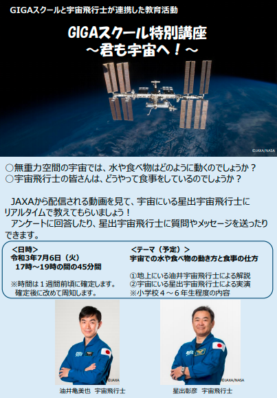 GIGAスクールと宇宙飛行士が連携した教育活動「GIGAスクール特別講座~君も宇宙へ!~」の開催について(外部サイト)