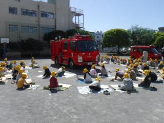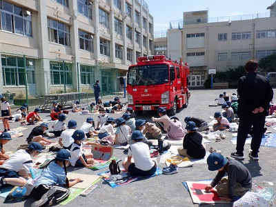 5月9日に2年生が消防写生会を行いました。消防車が校庭に入ってくる姿を見て、歓声が起こりました。