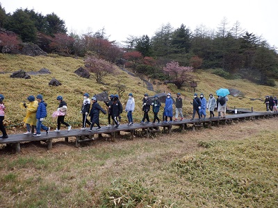 一日目は登山の予定でしたが、雨天のため「池の平湿原」散策を行いました。ガイドさんから動植物についてのお話を聞いたり、クラスみんなで「ヤッホ!」と声を出し、跳ね返りの体験を行ったりしました。