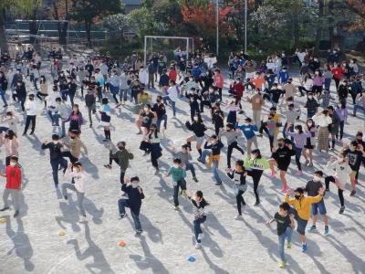 朝会をリードする先生が 「言うこと一緒 やること反対」「前」 と言うと、子供たちは「前」」と言いながら、後ろに体を動かします。