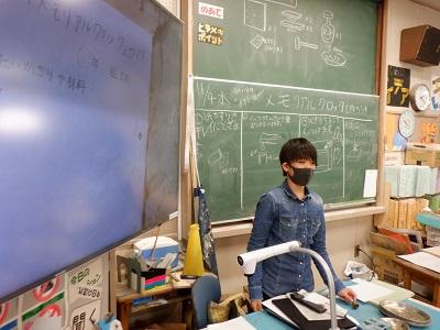 本来は、教室の前方に集まってお話を聞きますが、今年度は自席で距離を保ったまま、お話を聞きました。
