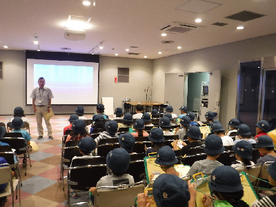 体育朝会では、VTRを見ながらプールに入るときの決まりを確認しました。