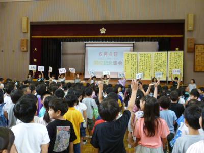 6月4日は、開桜小学校の開校記念日です。児童集会では、『開校記念集会』と題して、開桜小学校の誕生日を祝う集会を行いました。開桜小学校にまつわるクイズをしたり、お誕生日の歌を歌ったりしました♪