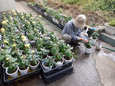 現在5年生は、園ボランさんにご指導いただきながら、菊を育てています。