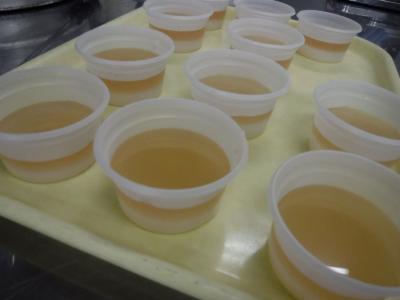 紅白ゼリーは、赤をアセロラジュース、白をカルピスで作りました。