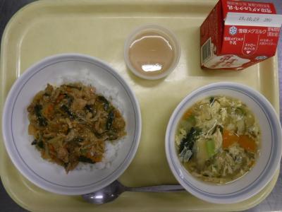 今日の献立は、豚キムチ丼、めかたま汁、紅白ゼリー、牛乳でした。