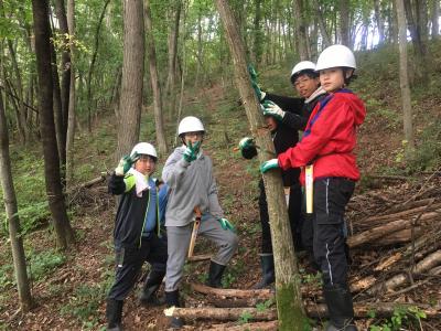 写真は、森林体験の様子です。ノコリギで木を切ったり森林の手入れなどをしました。