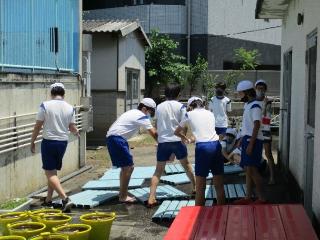 6年生全員がそれぞれの分担に分かれ、水泳の学習に必要な用具を運んでいました。