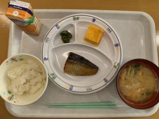 二日目の朝食はサバのみりん干しに具沢山のみそ汁です