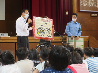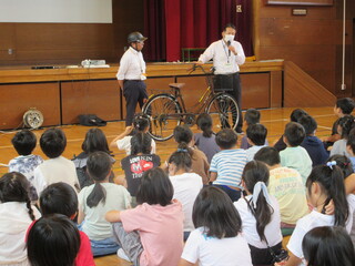 7月17日に自転車教室を行いました。講師には大田区教育委員会交通安全指導員の方、蒲田警察署の方をお招きしました。まずは、自転車に乗る前の点検の仕方のお話がありました。合言葉は「ぶたはしゃべる」。「ぶ」はブレーキ、「た」はタイヤ、「は」はハンドル、「シャ」は車体、「ベル」はベルのことだそうです。他にも、ブレーキの使い方、発進する前には右後ろも見ること、自転車は車の仲間であること、道路や歩道での走り方等を教えていただきました。様々なお話やクイズ、動画視聴を通して、自転車の正しい乗り方を学ぶことが出来ました。