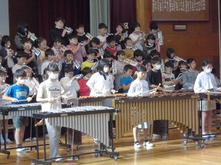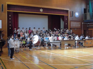 10月20日(金)、4年生が大田区民ホールアプリコ大ホールで連合音楽会に出演してきました。授業の他にも休み時間などを使って一生懸命練習に取り組み、とても素晴らしい演奏をしてくれました。大きなホールで演奏することはとても緊張したと思いますが、たくさんの拍手に包まれてよい経験になりました。保護者の皆様には、衣装の準備や会場に足をお運びいただき本当にありがとうございました。写真は体育館で全校に向けて演奏した時のものです。