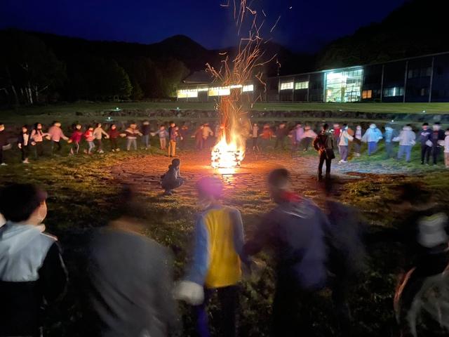 火の子たち(係児童)によって灯された聖なる火を囲んでキャンプファイヤーをしました。