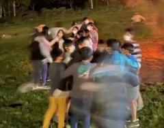 開校式では、代表児童が協力して生活することの大切さについてみんなに呼びかけました。その後、お風呂で疲れを癒やしました。