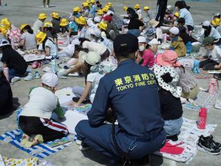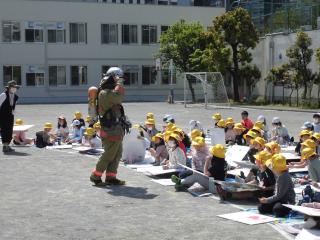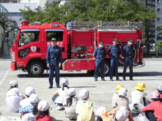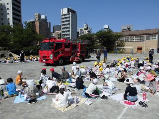 4月28日、すっきりとした青空の下、消防写生会が行われました。蒲田消防署の方々の協力のもと、ポンプ車が蒲田小学校にやってきました。消防士さんから、ポンプ車に積まれている道具について教えていただいたあと、校庭に広がり、大きな画用紙にポンプ車の絵を描きました。消防士さんも1、2年生の絵に興味津々!「こんな風に描けたよ!」と嬉しそうに話をしていました。今後、各教室で仕上げをした後、教室前の廊下に掲示します。