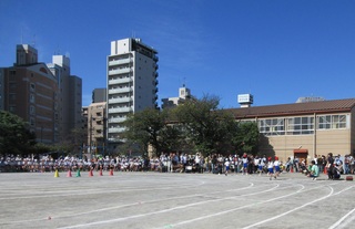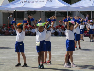 表現のトップバッターは1年生。頭に、オリジナルの花をつけて、元気いっぱいに踊りました。ニコニコ笑顔で踊る1年生の姿がとても印象的でした。短距離走では、ゴールに向かって一生懸命走ることができました。