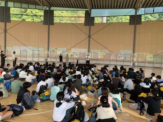 朝会は体育館。 ラジオ体操で体を動かすと、しっかり目が覚めてきたようです。