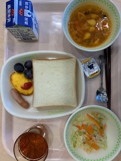 休養村とうぶでいただく最後の食事は、ソーセージ、オムレツ、ミネストローネ 。それぞれの水筒にお茶を入れてもらいます。