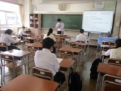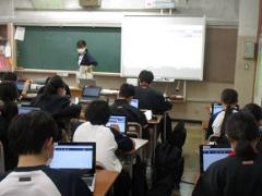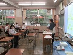 3年生と1年生の授業の様子です。3年生の英語は「受け身の表現」の練習、理科は「化学変化とイオン」の勉強をしています。1年社会は「緯度・経度」、数学は「正・負の数の乗法・除法」の勉強です。