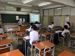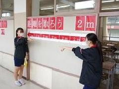 クラス全員が揃っての授業が始まりました。左右前後の友達との間隔は1mとり、授業中もマスクを着けたままで、感染予防に気を付けて授業を受けています。
