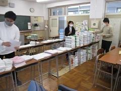 来週配布する臨時休校中の課題の袋詰め作業をしました。配布日時は11日~14日の8時~17時です。