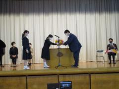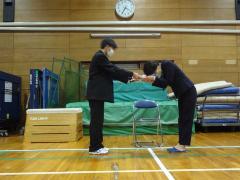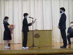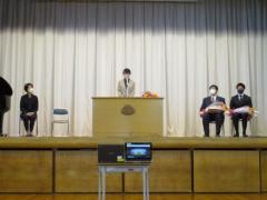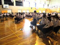 異動された先生をお迎えして離任式を行いました。代表の生徒から温かなメッセージと花束が贈られ、離任された先生一人ひとりからお話をいただきました。