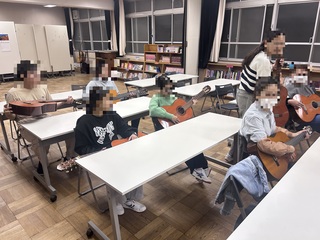[2時間目]音楽の授業の様子です。今日は、ギターを使った授業です。課題として与えられた楽譜を演奏することを目標に、指使いやコードを覚えながら取り組んでいます。