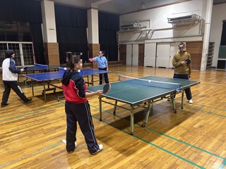 [3時間目]体育の授業です。今日の授業は、卓球です。初めてラケットを持つ生徒を得意な生徒が教えながら楽しんで取り組んでいます。
