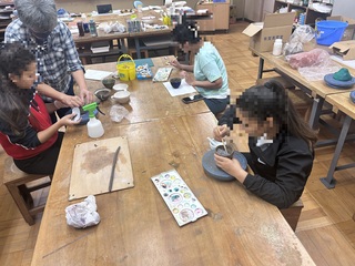 美術の授業の様子です。轆轤(ろくろ)を用いて作る陶器のカップを制作しています。皆自由な発想で形を成形したり、絵付けをしています。慣れない作業ですが、それぞれの創造力を発揮しながら作成しています。