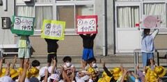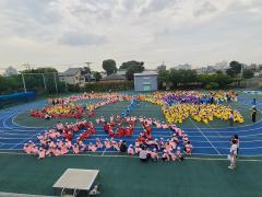 児童820人と先生たちがカラーエプロンをつけ、上空に飛んできたドローンに向かってエプロンを広げます。