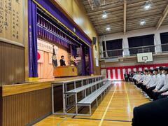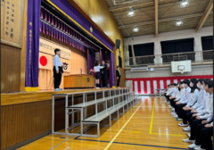 第一部では、祝辞や記念品贈呈が行われました。記念品贈呈では、130周年実行委員より「体育館ステージ用の一文字幕、源氏幕、引割緞帳」、本校PTAより「記念誌、祝菓、トートバッグ」、本校同窓会より「記念樹」をいただきました。