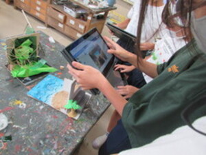タブレットを使ってコマ撮りアニメーションをつくっていきます。使用する教科書の会社が提供するアプリをつかって簡単にできるコマ撮りに、子どもたちは興味津々です。