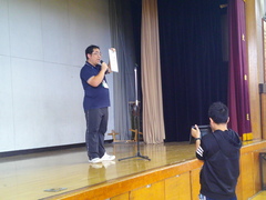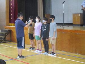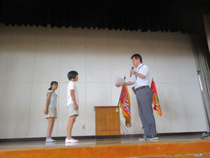 校長先生からのお話。はじめに、馬込FCの夏休み中の大会の表彰を行いました。5,6年のチームを代表して、キャプテンと副キャプテンが登壇。それぞれ急きょのインタビューにしっかりと応えました。