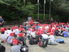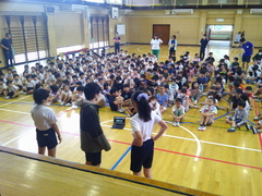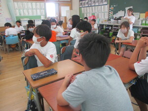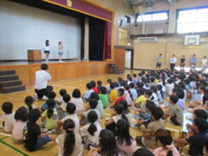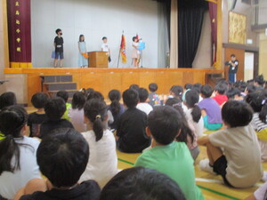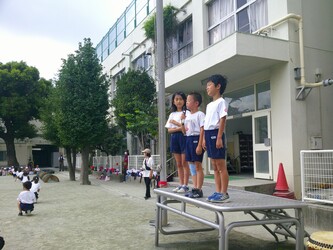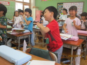 最後に、明日5日から5年生が伊豆高原移動教室に出かけることについて紹介がありました。5年生は、教室でリモート参加の朝会だったため、体育館や2・3年生の教室から5年生に向けて、みんなで「がんばれ!」と大きな声援を送りました。5年生の教室まで届いたかな?