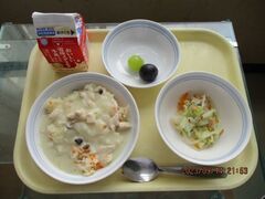給食の献立:ジョロフライス&チキンステーキ、オクロスープ、フレンチポテトサラダ、牛乳