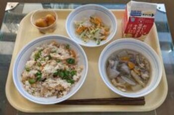 給食の献立:ごもくごはん、こんにゃくのみそドレサラダ、けんちん汁、月見団子、牛乳