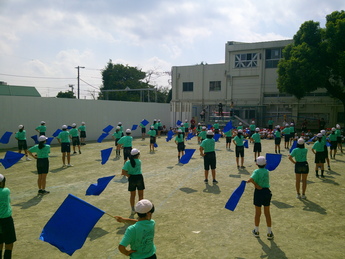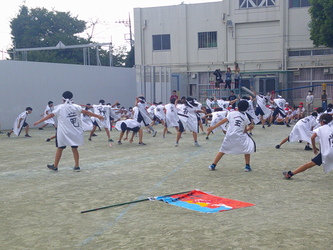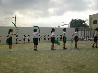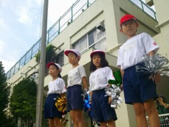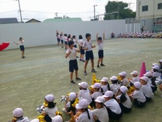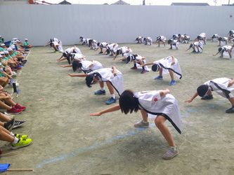 ダンシング玉入れは1回戦1組、2回戦2組、3回戦3組が勝利するという結果になりました。どのクラスも練習よりたくさんの玉を入れることができ、数えるのが大変でした。40m走では猛スピードで駆け抜けるかっこいい姿が見られました。はじめてのフラッグ、組体操では最高学年らしい素晴らしい演技を見せることができました。今まで担任してくださった先生方や前校長先生が見に来てくださり、子供たちは大喜びでした。中には泣いてしまっている子もいました。子供も教員も大満足で今年の運動会を終えることができました。